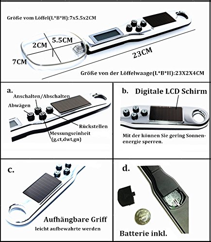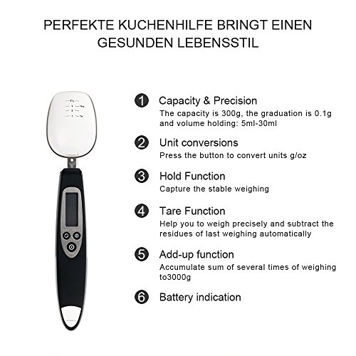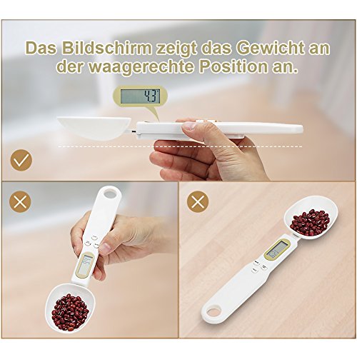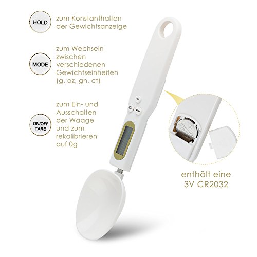 Gewicht angeht, so haben die meisten Löffelwaagen in der Regel eine Tragfähigkeit von mehreren hundert Gramm, oft bis zu einem halben Kilogramm. Die Genauigkeit ist sehr groß und unterscheidet sich von „normalen“ Küchenwaagen im Grunde nicht sonderlich – meist in Schritten von 0,1g, wobei es auch Modelle gibt, die erst ab 1g „anspringen“. Bitte prüfen Sie dies einfach in der Produktbeschreibung und entscheiden Sie dann, welches Modell für Ihre Bedürfnisse das Beste ist.